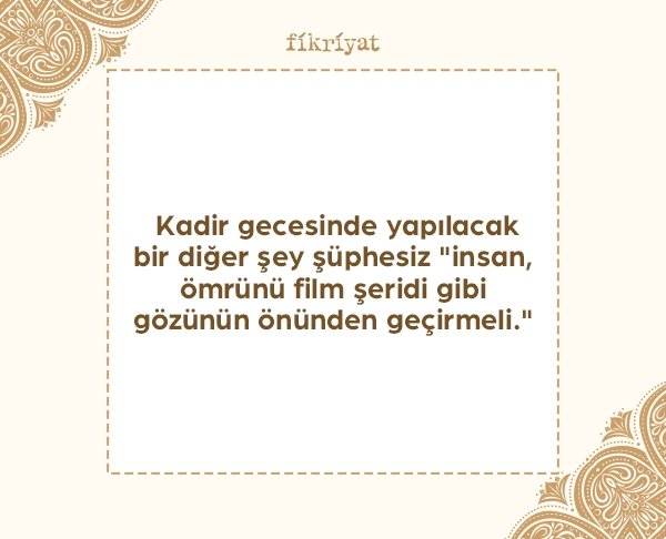 🔹 Kadir gecesinde yapılacak bir diğer şey şüphesiz "insan, ömrünü film şeridi gibi gözünün önünden geçirmeli." Kimsenin olmadığı bir ortamda, yapılan hatalardan dolayı pişmanlık duyarak "gönülden bir tövbe" ile Allah'a (CC) yönelmek ruhu hafifletir.