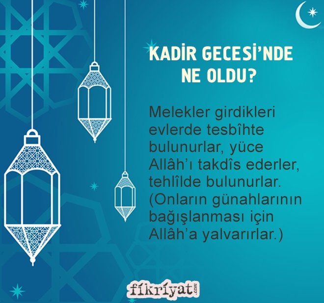 Bu mübarek gecede başta Cebrâil -aleyhisselâm- olmak üzere yeryüzüne birçok melek iner ve mü'minler için Rabbimize duâ ve istiğfarda bulunurlar. Bu durum şöyle rivâyet edilir: