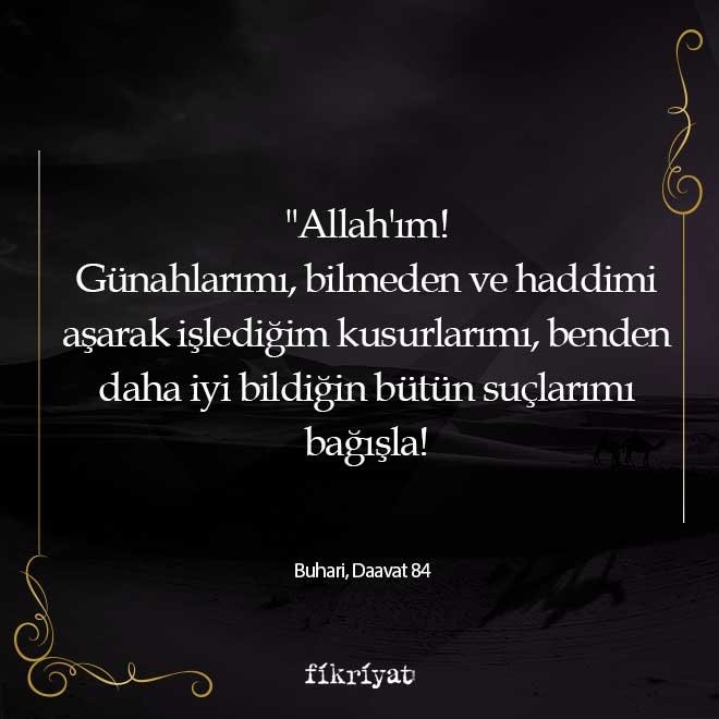 "Allah'ım! Günahlarımı, bilmeden ve haddimi aşarak işlediğim kusurlarımı, benden daha iyi bildiğin bütün suçlarımı bağışla! Allah'ım! Ciddi veya şaka olarak yaptığım yanlışları, hataen ve kasten işlediğim günahlarımı affeyle! Bütün bu kusurların bende bulunduğunu itiraf ederim. Allah'ım! Şimdiye kadar yaptığım, bundan sonra yapacağım, gizlediğim ve açığa vurduğum, ölçüsüz bir şekilde işlediğim ve benden daha iyi bildiğin günahlarımı affeyle! Öne geçiren de sen, geride bırakan da sensin. Senin gücün her şeye yeter."