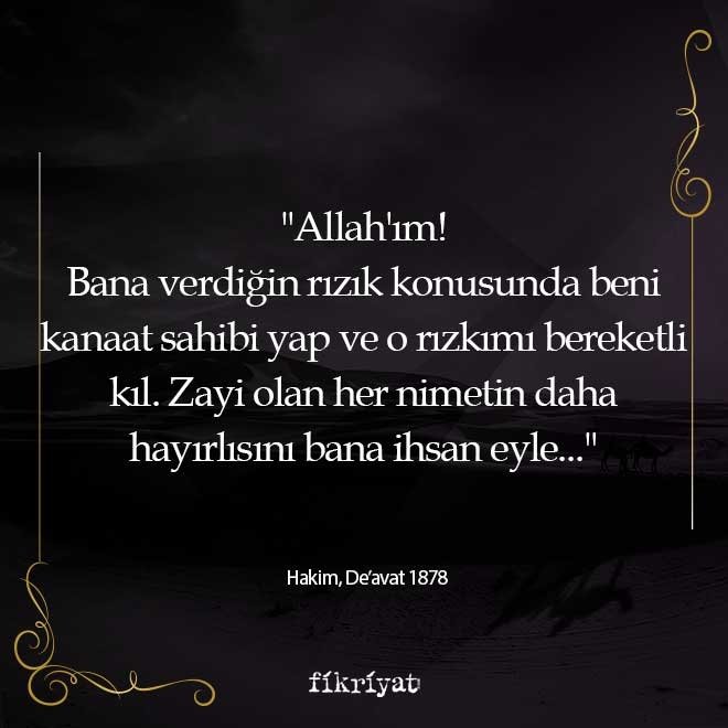 "Allah'ım! Bana verdiğin rızık konusunda beni kanaat sahibi yap ve o rızkımı bereketli kıl. Zayi olan her nimetin daha hayırlısını bana ihsan eyle..."