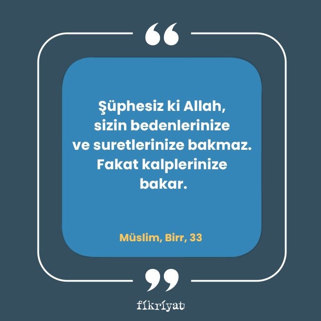 "Şüphesiz ki Allah, sizin bedenlerinize ve suretlerinize bakmaz. Fakat kalplerinize bakar." (Müslim, Birr, 33)