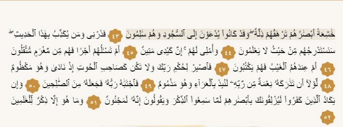 43. Haşi'aten ebsaruhum terhekuhum zillefun ve kad kanu yud'avne ilessucudi ve lum salimune.