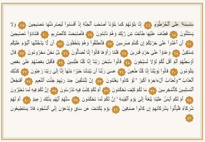 19-20. Fakat onlar uykudayken rabbin tarafından gelen kuşatıcı bir âfet bahçeyi sarıverdi de bahçe kesilip kurumuş gibi oldu.