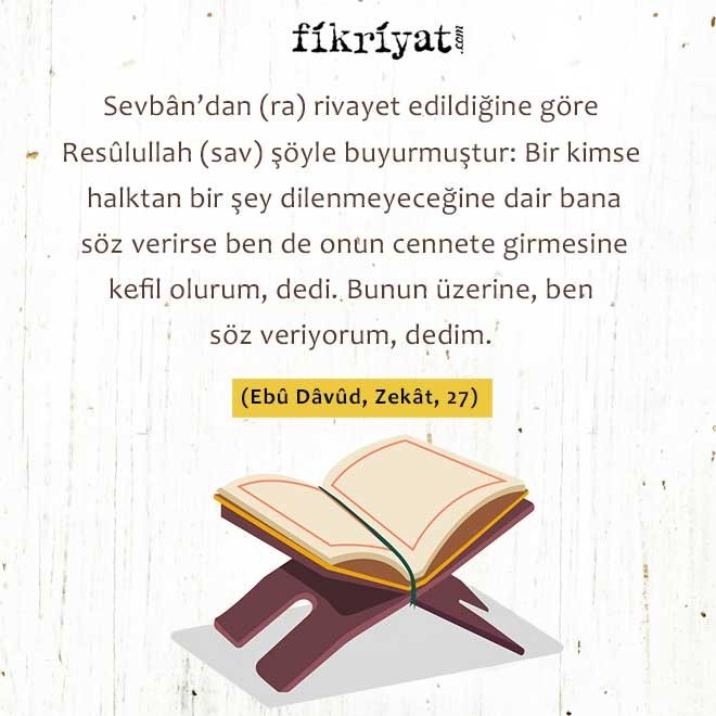 Sevbân'dan (ra) rivayet edildiğine göre Resûlullah (sav) şöyle buyurmuştur: Bir kimse halktan bir şey dilenmeyeceğine dair bana söz verirse ben de onun cennete girmesine kefil olurum, dedi. Bunun üzerine, ben söz veriyorum, dedim. Ravi diyor ki: Sevbân, hiç kimseden bir şey istemezdi.