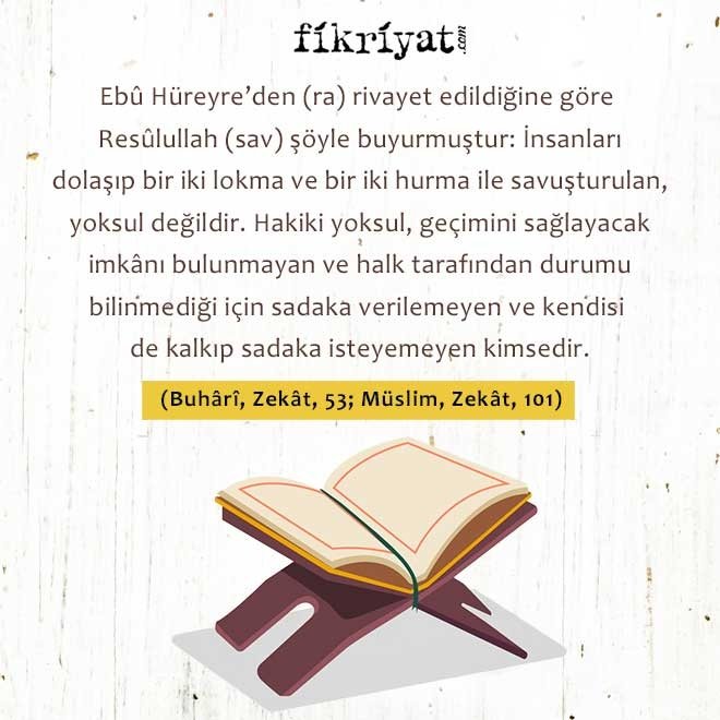 Ebû Hüreyre'den (ra) rivayet edildiğine göre Resûlullah (sav) şöyle buyurmuştur: İnsanları dolaşıp bir iki lokma ve bir iki hurma ile savuşturulan, yoksul değildir. Hakiki yoksul, geçimini sağlayacak imkânı bulunmayan ve halk tarafından durumu bilinmediği için sadaka verilemeyen ve kendisi de kalkıp sadaka isteyemeyen kimsedir.