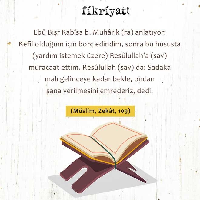 Ebû Bişr Kabîsa b. Muhârık (ra) anlatıyor: Kefil olduğum için borç edindim, sonra bu hususta (yardım istemek üzere) Resûlullah'a (sav) müracaat ettim. Resûlullah (sav) da: Sadaka malı gelinceye kadar bekle, ondan sana verilmesini emrederiz, dedi. Sonra: Yâ Kabîsa, istemek yalnız üç kimse için helâldir: Kefalet üstlenen kimse için borcunu ödeyinceye kadar istemesi helâldir, sonra istemeyi bırakır. Büyük bir kazaya uğrayıp bütün malını kaybeden kimsenin geçimini yoluna koyacak kadar istemesi helâldir. Biri son derece fakir düşer de kavminden aklı başında en az üç kişi, "Çok fakir kaldı." derlerse o takdirde o kimsenin geçimini temin edecek kadar istemesi de helâl olur. İşte yâ Kabîsa, bunun haricindeki istemeler haramdır, bunu yapan şüphesiz haram yemiş olur.