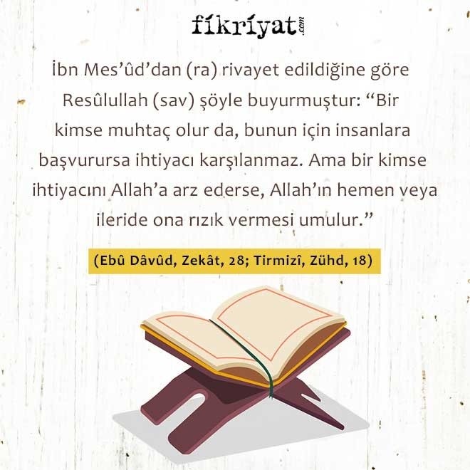 İbn Mes'ûd'dan (ra) rivayet edildiğine göre Resûlullah (sav) şöyle buyurmuştur: "Bir kimse muhtaç olur da, bunun için insanlara başvurursa ihtiyacı karşılanmaz. Ama bir kimse ihtiyacını Allah'a arz ederse, Allah'ın hemen veya ileride ona rızık vermesi umulur."