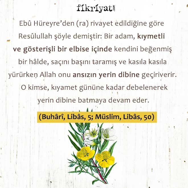 Ebû Hüreyre'den (ra) rivayet edildiğine göre Resûlullah şöyle demiştir: Bir adam, kıymetli ve gösterişli bir elbise içinde kendini beğenmiş bir hâlde, saçını başını taramış ve kasıla kasıla yürürken Allah onu ansızın yerin dibine geçiriverir. O kimse, kıyamet gününe kadar debelenerek yerin dibine batmaya devam eder.