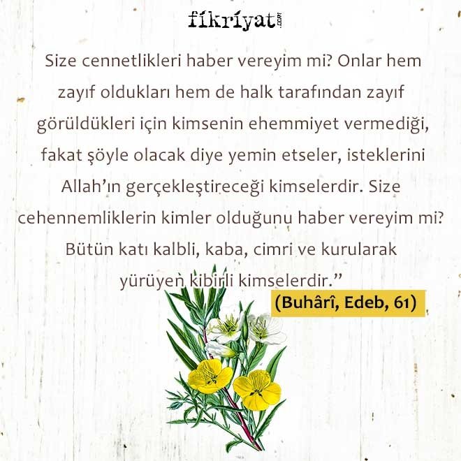 Hârise bin Vehb el-Huzâî'den (r.a) rivâyete göre Nebiyy-i Ekrem şöyle buyurmuştur: