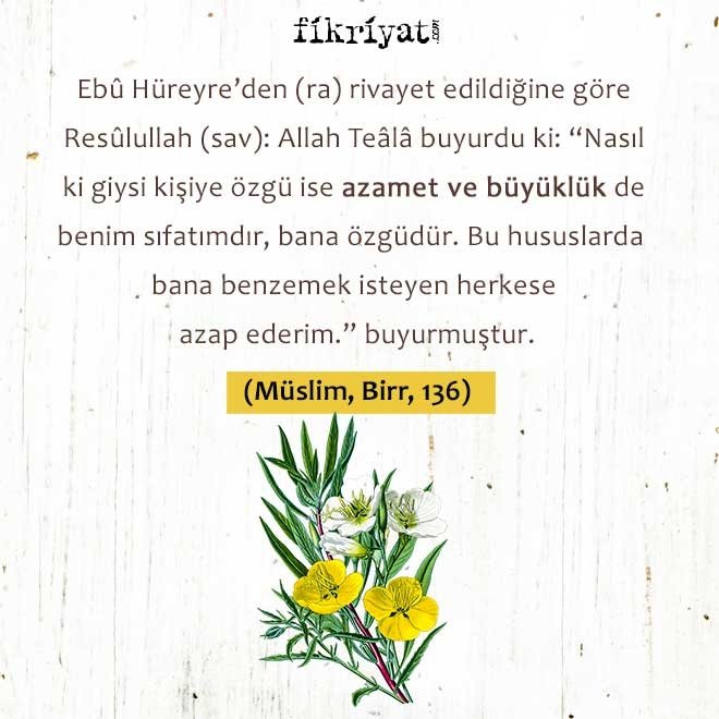 Ebû Hüreyre'den (ra) rivayet edildiğine göre Resûlullah (sav): Allah Teâlâ buyurdu ki: "Nasıl ki giysi kişiye özgü ise azamet ve büyüklük de benim sıfatımdır, bana özgüdür. Bu hususlarda bana benzemek isteyen herkese azap ederim." buyurmuştur.