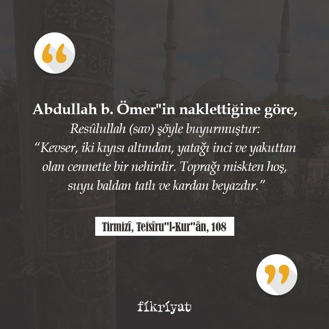 Resûlullah (sav) şöyle buyurmuştur: "Kevser, iki kıyısı altından, yatağı inci ve yakuttan olan cennette bir nehirdir. Toprağı miskten hoş, suyu baldan tatlı ve kardan beyazdır."