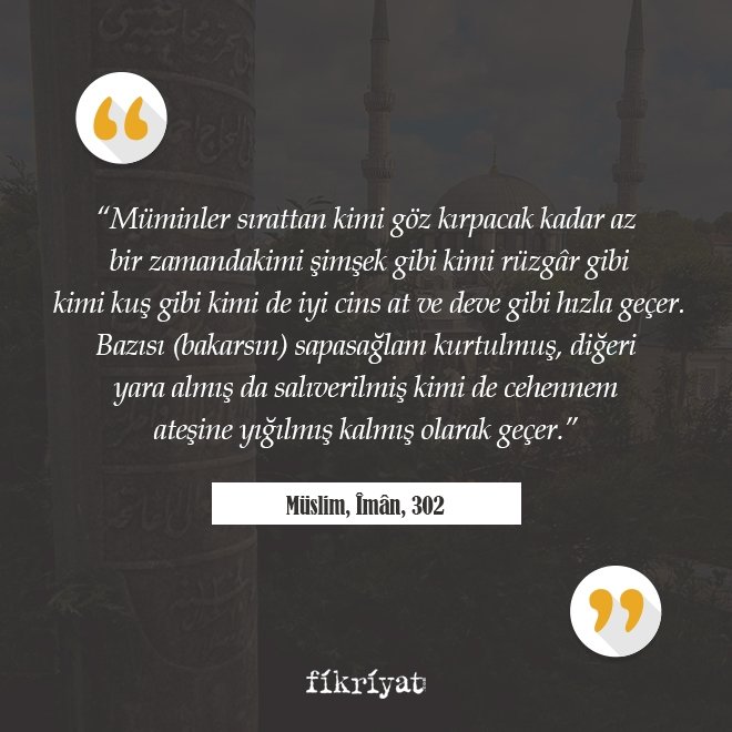 ◾ "Müminler sırattan kimi göz kırpacak kadar az bir zamanda, kimi şimşek gibi, kimi rüzgâr gibi, kimi kuş gibi, kimi de iyi cins at ve deve gibi hızla geçer. Bazısı (bakarsın) sapasağlam kurtulmuş, diğeri yara almış da salıverilmiş, kimi de cehennem ateşine yığılmış kalmış olarak geçer."