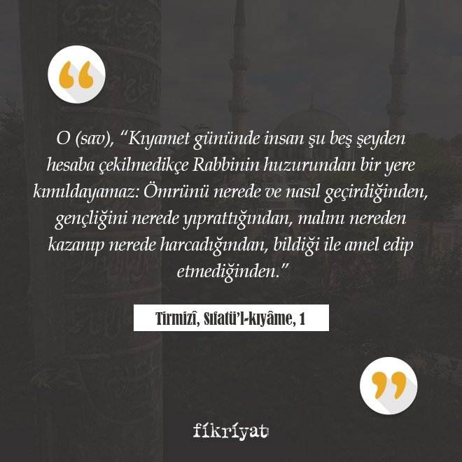 ◾ O (sav), "Kıyamet gününde insan şu beş şeyden hesaba çekilmedikçe Rabbinin huzurundan bir yere kımıldayamaz: Ömrünü nerede ve nasıl geçirdiğinden, gençliğini nerede yıprattığından, malını nereden kazanıp nerede harcadığından, bildiği ile amel edip etmediğinden."