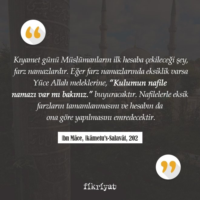◾ Kıyamet günü Müslümanların ilk hesaba çekileceği şey, farz namazlardır. Eğer farz namazlarında eksiklik varsa Yüce Allah meleklerine, "Kulumun nafile namazı var mı bakınız." buyuracaktır. Nafilelerle eksik farzların tamamlanmasını ve hesabın da ona göre yapılmasını emredecektir.