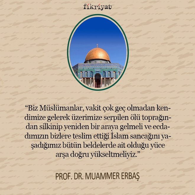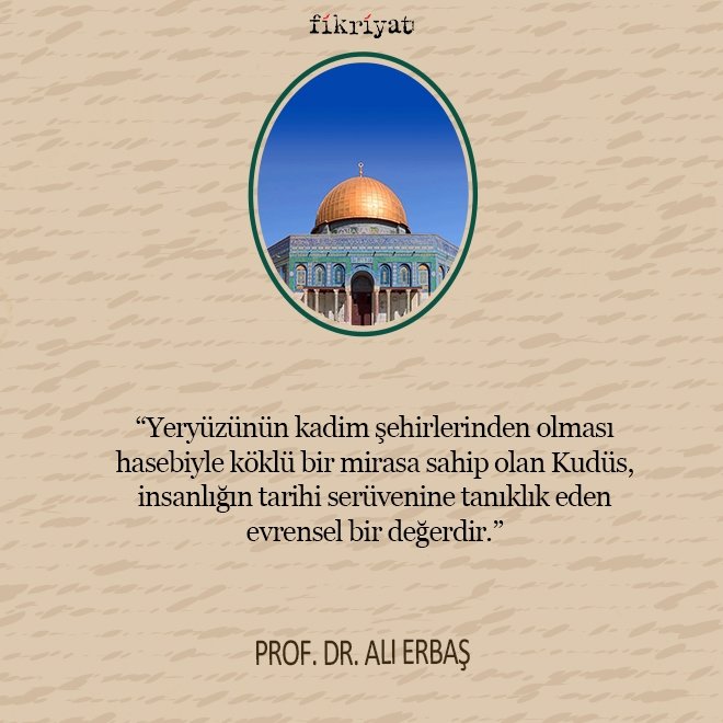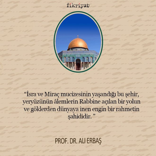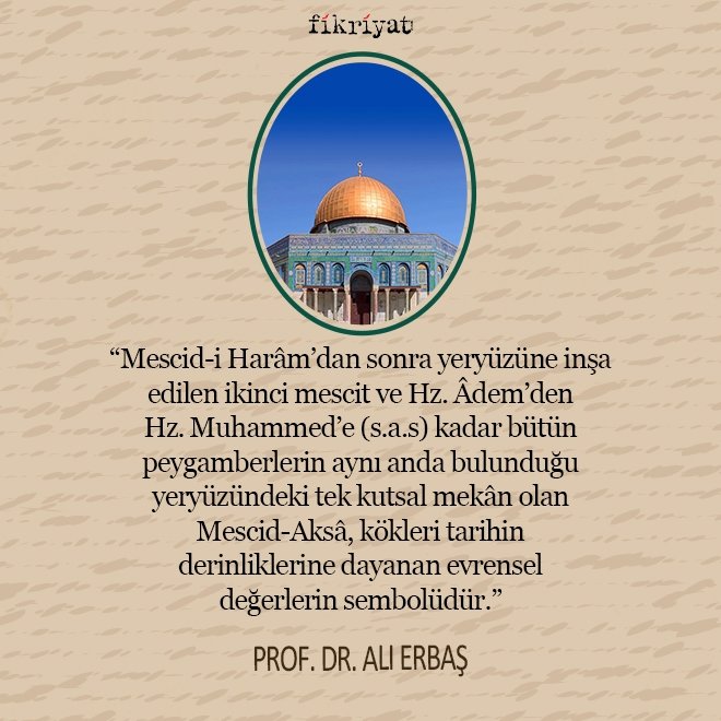 "Mescid-i Harâm'dan sonra yeryüzüne inşa edilen ikinci mescit ve Hz. Âdem'den Hz. Muhammed'e (SAV) bütün peygamberlerin aynı anda bulunduğu yeryüzündeki tek kutsal mekân olan Mescid-i Aksâ,kökleri tarihin derinliklerine dayanan evrensel değerlerin sembolüdür."