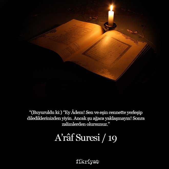 "(Buyuruldu ki:) "Ey Âdem! Sen ve eşin cennette yerleşip dilediklerinizden yiyin. Ancak şu ağaca yaklaşmayın! Sonra zalimlerden olursunuz." (A'râf suresi, 19. ayet)