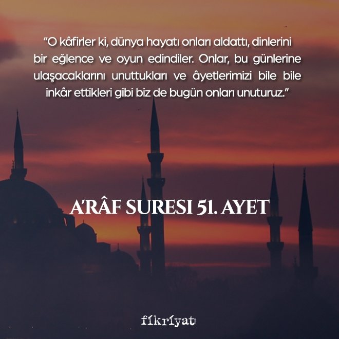"O kâfirler ki, dünya hayatı onları aldattı, dinlerini bir eğlence ve oyun edindiler. Onlar, bu günlerine ulaşacaklarını unuttukları ve âyetlerimizi bile bile inkâr ettikleri gibi biz de bugün onları unuturuz."