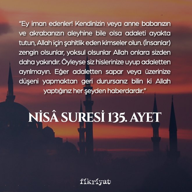 "Ey iman edenler! Kendinizin veya anne babanızın ve akrabanızın aleyhine bile olsa adaleti ayakta tutun, Allah için şahitlik eden kimseler olun. (İnsanlar) zengin olsunlar, yoksul olsunlar Allah onlara sizden daha yakındır. Öyleyse siz hislerinize uyup adaletten ayrılmayın. Eğer adaletten sapar veya üzerinize düşeni yapmaktan geri durursanız bilin ki Allah yaptığınız her şeyden haberdardır."