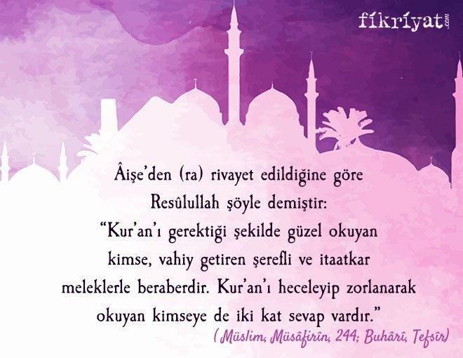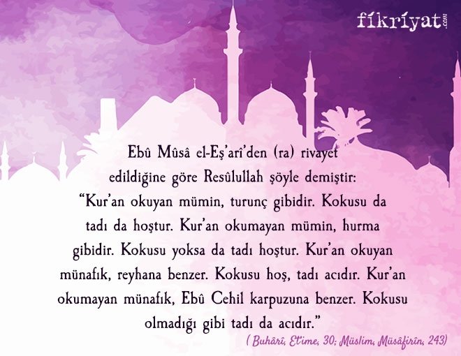 "Kur'an okuyan mümin, turunç gibidir. Kokusu da tadı da hoştur. Kur'an okumayan mümin, hurma gibidir. Kokusu yoksa da tadı hoştur. Kur'an okuyan münafık, reyhana benzer. Kokusu hoş, tadı acıdır. Kur'an okumayan münafık, Ebû Cehil karpuzuna benzer. Kokusu olmadığı gibi tadı da acıdır."