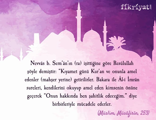 "Kıyamet günü Kur'an ve onunla amel edenler (mahşer yerine) getirilirler. Bakara ile Âl-i İmrân sureleri, kendilerini okuyup amel eden kimsenin önüne geçerek "Onun hakkında ben şahitlik edeceğim." diye birbirleriyle mücadele ederler."