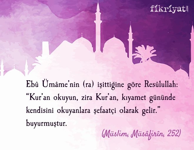"Kur'an okuyun, zira Kur'an, kıyamet gününde kendisini okuyanlara şefaatçi olarak gelir." buyurmuştur.