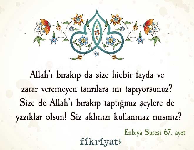 Biraz sonra yine dönüş yaptılar. "Sen bunların konuşmadığını pekâlâ biliyorsun" dediler. İbrahim, "Allah'ı bırakıp da size hiçbir fayda ve zarar veremeyen tanrılara mı tapıyorsunuz? Size de Allah'ı bırakıp taptığınız şeylere de yazıklar olsun! Siz aklınızı kullanmaz mısınız?" dedi.
