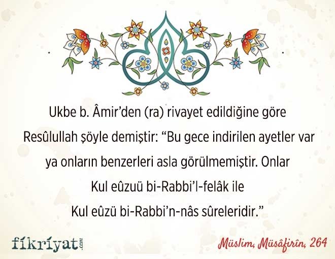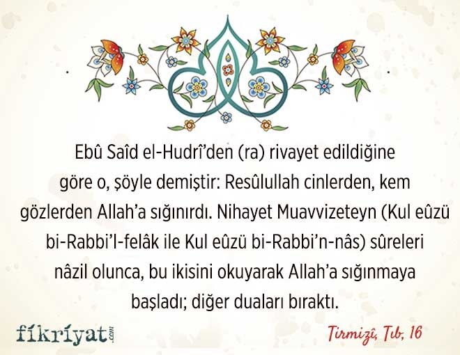 Resûlullah cinlerden, kem gözlerden Allah'a sığınırdı. Nihayet Muavvizeteyn (Kul eûzü bi-Rabbi'l-felâk ile Kul eûzü bi-Rabbi'n-nâs) sûreleri nâzil olunca, bu ikisini okuyarak Allah'a sığınmaya başladı; diğer duaları bıraktı.