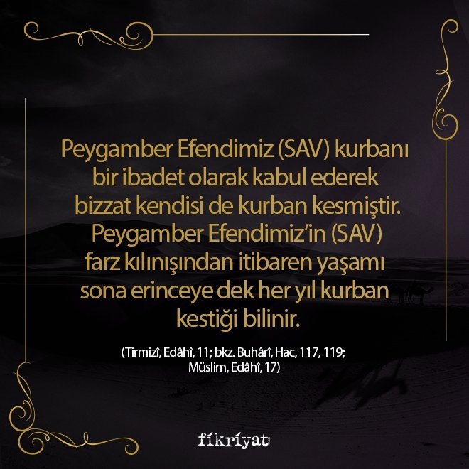 🔴 Peygamber Efendimiz'in (SAV) Kurban Bayramı'nda Allah (CC) katında en sevimli ibadetin kurban kesmek olduğunu, kurbanın kesilir kesilmez Allah (CC) katında makbul olacağını ve kurban edilen hayvanın boynuzu, tırnağı da dâhil olmak üzere her şeyinin kişinin hayır hanesine yazılacağını ifade ederek bu ibadetin Allah (CC) rızası için yapılmasını tavsiye etmiştir.