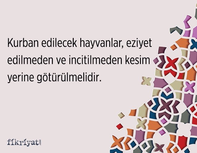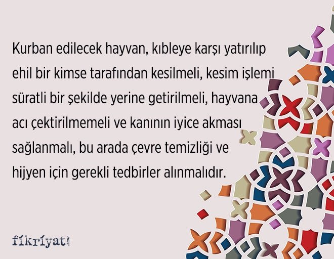 Diğer gayelerle yapılan kesimlerde olduğu gibi kurbanlık hayvanın kesiminde de bazı kurallara uymak gerekir. Kurban edilecek hayvanın, kurban olma şartlarını taşıması, veteriner kontrolünden geçmesi son derece önemlidir. Kurban edilecek hayvanlar, eziyet edilmeden ve incitilmeden kesim yerine götürülmelidir.
