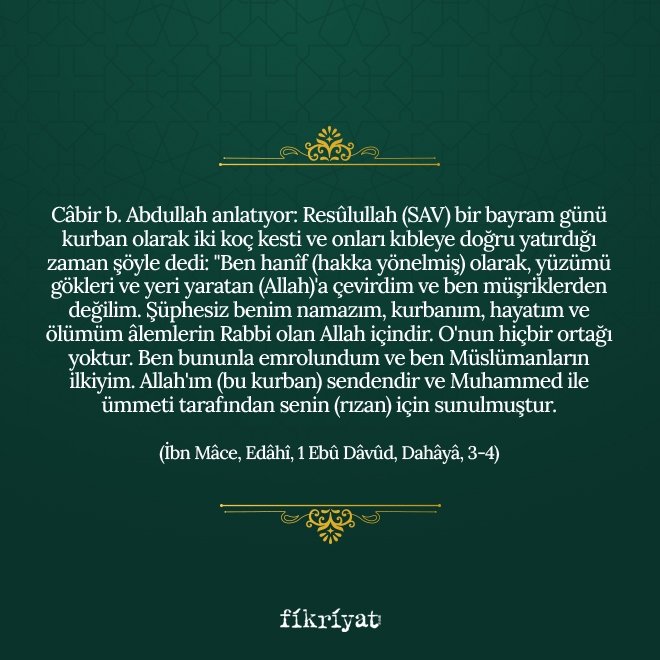 "Câbir b. Abdullah anlatıyor: Resûlullah (SAV) bir bayram günü kurban olarak iki koç kesti ve onları kıbleye doğru yatırdığı zaman şöyle dedi: "Ben hanîf (hakka yönelmiş) olarak, yüzümü gökleri ve yeri yaratan (Allah)'a çevirdim ve ben müşriklerden değilim. Şüphesiz benim namazım, kurbanım, hayatım ve ölümüm âlemlerin Rabbi olan Allah içindir. O'nun hiçbir ortağı yoktur. Ben bununla emrolundum ve ben Müslümanların ilkiyim. Allah'ım (bu kurban) sendendir ve Muhammed ile ümmeti tarafından senin (rızan) için sunulmuştur."
