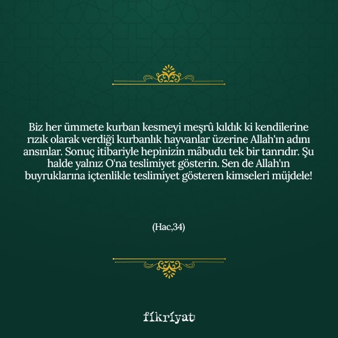 "Biz her ümmete kurban kesmeyi meşrû kıldık ki kendilerine rızık olarak verdiği kurbanlık hayvanlar üzerine Allah'ın adını ansınlar. Sonuç itibariyle hepinizin mâbudu tek bir tanrıdır. Şu halde yalnız O'na teslimiyet gösterin. Sen de Allah'ın buyruklarına içtenlikle teslimiyet gösteren kimseleri müjdele!"
