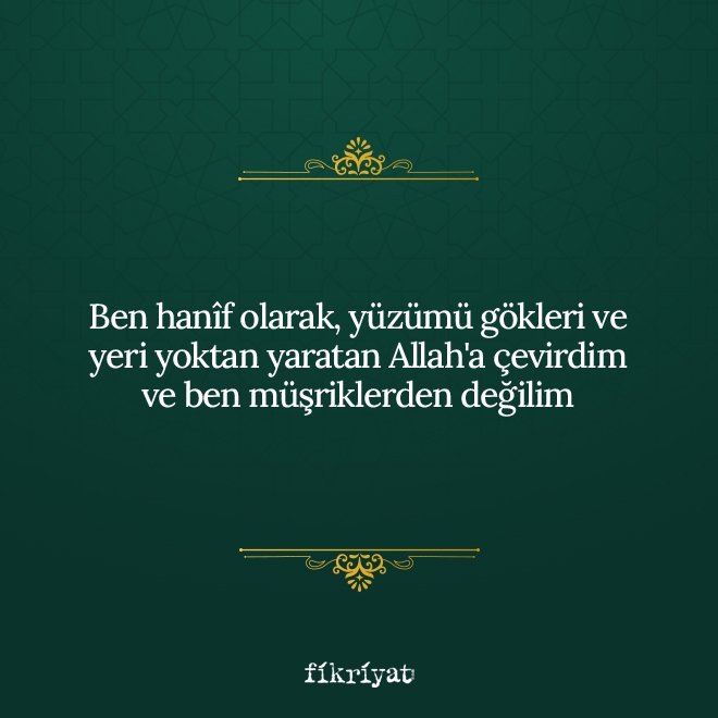 ↪ Anlamı: Ben hanîf olarak, yüzümü gökleri ve yeri yoktan yaratan Allah'a çevirdim ve ben müşriklerden değilim.