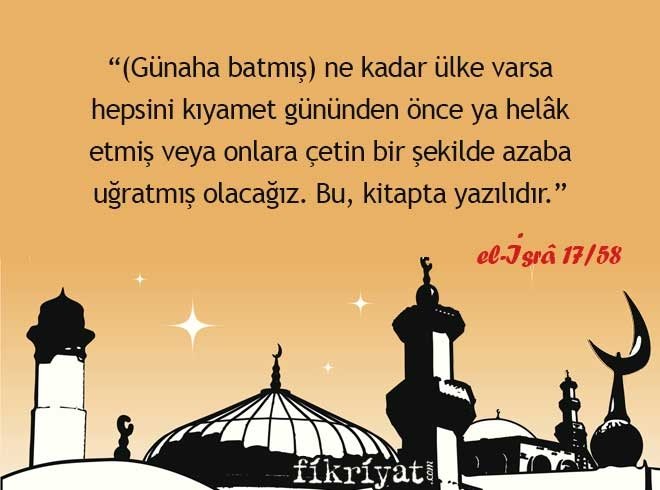 "(Günaha batmış) ne kadar ülke varsa hepsini kıyamet gününden önce ya helâk etmiş veya onlara çetin bir şekilde azaba uğratmış olacağız. Bu, kitapta yazılıdır."