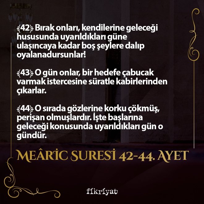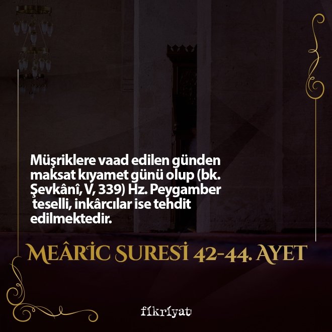 🔹 Müşriklere vaad edilen günden maksat kıyamet günü olup (bk. Şevkânî, V, 339) Hz. Peygamber teselli, inkârcılar ise tehdit edilmektedir. Müşrikler inkârlarını inatla sürdürdükleri için Allah Teâlâ peygamberine artık onları kendi hallerine bırakmasını, zamanı geldiğinde inkâr ettikleri o günü göreceklerini, hatta o zaman –inkâr etmek şöyle dursun– bir hedefe koşan yarışçılar gibi kabirlerinden kalkıp koşarak hesap yerine sevkedileceklerini haber vermektedir. Ancak Hz. Peygamber ile alay ettikleri zamanki gibi şen şakrak değil, orada kibirleri kırılmış, gözlerine korku düşmüş, utançlarından başlarını kaldıracak halleri kalmamış bir halde ve derin bir üzüntü içerisinde olacaklardır.