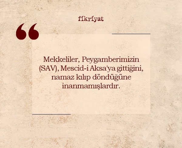 ◾ Miraç'tan dönen Peygamberimiz (SAV), çevresindekilere Mescid-i Aksa'ya gittiğini, namaz kılıp döndüğünü söylediğinde bulunduğu yerdeki birçok kişi alemlere rahmet olarak gönderilen Peygamberimize inanmamışlardır.
