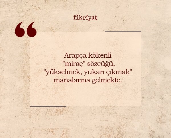 ◾ Arapça kökenli "miraç" sözcüğü, "yükselmek, yukarı çıkmak" manalarına gelmektedir. Miraç Kandili, sevgili Peygamberimiz Hz. Muhammed'in (SAV) Mekke'de bir gece Rabbimizin daveti üzerine sonsuz kudretinin gösterilmesi için önce Mescid-i Aksa'ya, oradan da semaya yaptırılan yolculuğun ve mucizevî buluşmanın adıdır.
