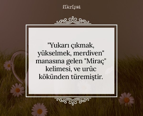 ◻ "Yukarı çıkmak, yükselmek, merdiven" manasına gelen "Miraç" kelimesi, ve urûc kökünden türemiştir. Miraç olayı, Hz. Peygamber'in (SAV) göğe yükselişini ve Allah (CC) katına çıkışıdır.