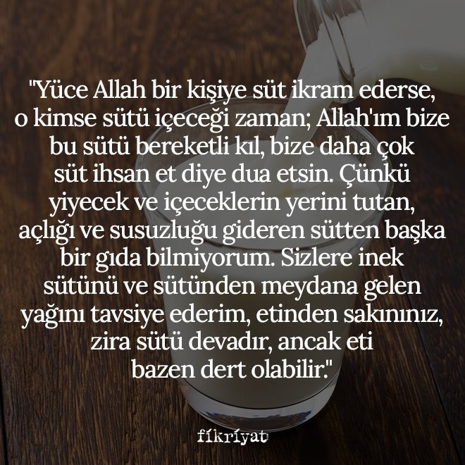 ◻ Peygamber Efendimiz (SAV) rivayetlere göre sütü severdi ve şöyle buyururdu: "Yüce Allah bir kişiye süt ikram ederse, o kimse sütü içeceği zaman; Allah'ım bize bu sütü bereketli kıl, bize daha çok süt ihsan et diye dua etsin. Çünkü yiyecek ve içeceklerin yerini tutan, açlığı ve susuzluğu gideren sütten başka bir gıda bilmiyorum. Sizlere inek sütünü ve sütünden meydana gelen yağını tavsiye ederim, etinden sakınınız, zira sütü devadır, ancak eti bazen dert olabilir."