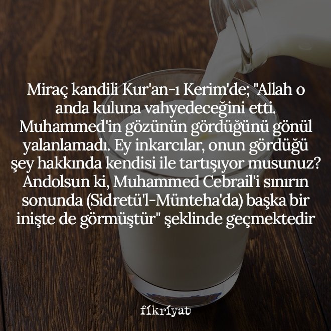 ◻ Miraç kandili Kur'an-ı Kerim'de; "Allah o anda kuluna vahyedeceğini etti. Muhammed'in gözünün gördüğünü gönül yalanlamadı. Ey inkarcılar, onun gördüğü şey hakkında kendisi ile tartışıyor musunuz? Andolsun ki, Muhammed Cebrail'i sınırın sonunda (Sidretü'l-Münteha'da) başka bir inişte de görmüştür" şeklinde geçmektedir.