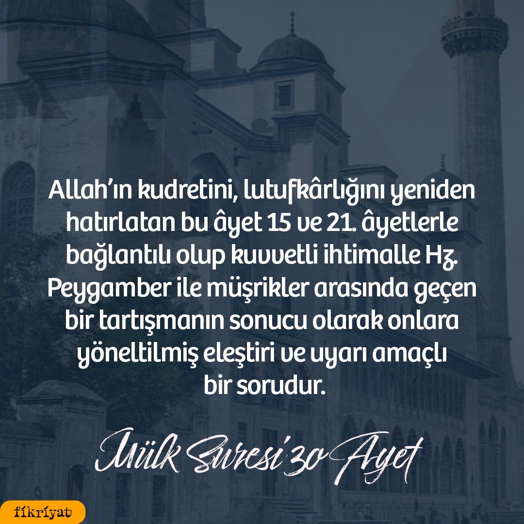 ◼ Allah'ın kudretini, lutufkârlığını yeniden hatırlatan bu âyet 15 ve 21. âyetlerle bağlantılı olup kuvvetli ihtimalle Hz. Peygamber ile müşrikler arasında geçen bir tartışmanın sonucu olarak onlara yöneltilmiş eleştiri ve uyarı amaçlı bir sorudur. 15. âyette Allah'ın yeryüzünü kullanışlı hale getirdiği ifade edildikten sonra insanlardan O'nun yarattığı rızıklardan yararlanmaları istenmiş; 21. âyette de rızkın Allah'a ait olduğu, O verdiği rızkı kestiği takdirde rızık verecek birinin asla bulunmayacağı bildirilmişti. Burada da rızıkların en önemlisi ve hayatın ana unsuru olan suyun yerin derinliklerine çekilmesi halinde Allah'tan başka yeryüzünde su yaratacak bir gücün bulunmadığına işaret edilerek, böylesine eşsiz kudretin sahibi yüce Allah'ı bırakıp da bâtıl tanrılara tapanlar, ne kadar yanlış bir yolda oldukları üzerinde düşünmeye çağrılmaktadır.