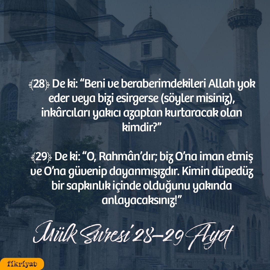 ﴾29﴿ De ki: "O, Rahmân'dır; biz O'na iman etmiş ve O'na güvenip dayanmışızdır. Kimin düpedüz bir sapkınlık içinde olduğunu yakında anlayacaksınız!"