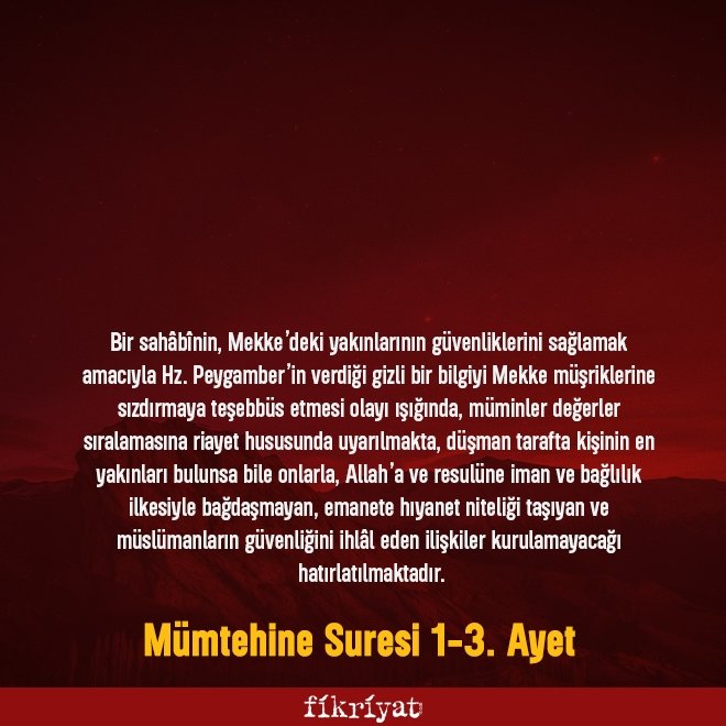 ﴾1﴿ Ey iman edenler! Eğer benim yolumda cihad etmek ve hoşnutluğumu kazanmak üzere yola çıkmışsanız, benim de düşmanım sizin de düşmanınız olan kimseleri kendilerine sevgi göstererek dost edinmeyin. Onlar size gelen gerçeği inkâr etmektedirler; üstelik rabbiniz Allah'a iman ettiniz diye peygamberi ve sizi (yurdunuzdan) çıkarıyorlar. Ben sizin gizlediklerinizi de açıkladıklarınızı da bildiğim halde onlara gizliden gizliye sevgi besliyorsunuz. İçinizden kim bunu yaparsa bilsin ki doğru yoldan sapmıştır.