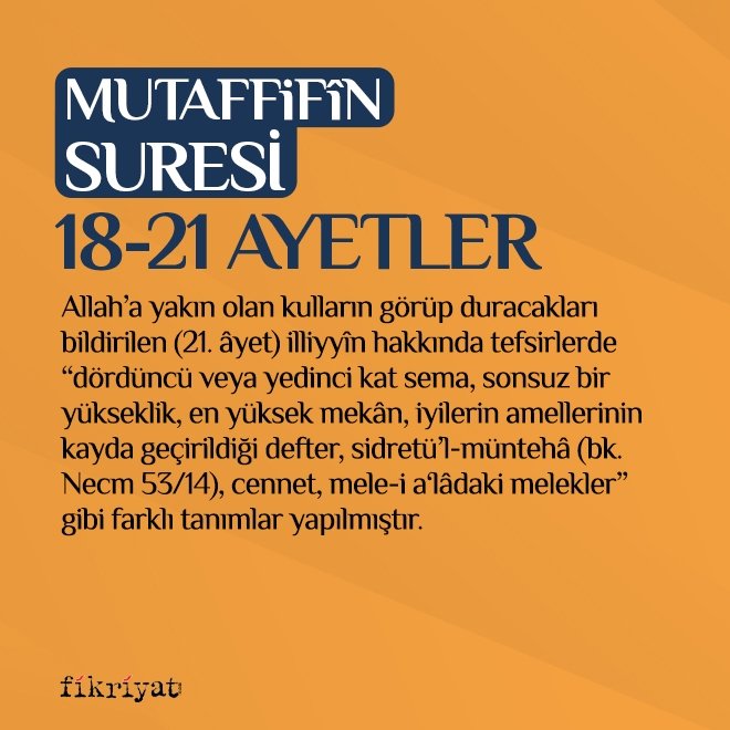 ➡ Allah'a yakın olan kulların görüp duracakları bildirilen (21. âyet) illiyyîn hakkında tefsirlerde "dördüncü veya yedinci kat sema, sonsuz bir yükseklik, en yüksek mekân, iyilerin amellerinin kayda geçirildiği defter, sidretü'l-müntehâ (bk. Necm 53/14), cennet, mele-i a'lâdaki melekler" gibi farklı tanımlar yapılmıştır (Taberî, XXX, 64-65; Râzî, XXXI, 96-97; Şevkânî, V, 466). Tariflerden illiyyîn ile siccînin aynı şeyler olduğu, ancak izâfe edildikleri kimseler ve içerikleri açısından aralarında bir nitelik farkı bulunduğu anlaşılmaktadır. Râzî bu farkı özetle şöyle izah etmiştir.