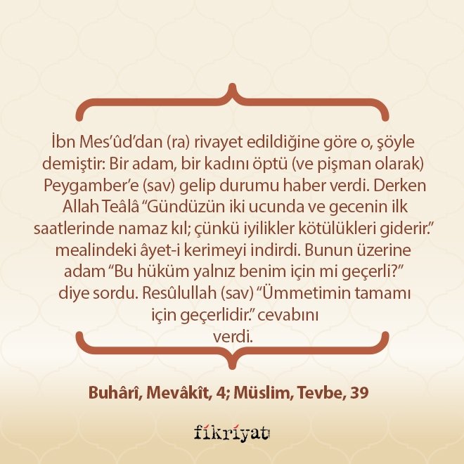 İbn Mes'ûd'dan (ra) rivayet edildiğine göre o, şöyle demiştir: Bir adam, bir kadını öptü (ve pişman olarak) Peygamber'e (sav) gelip durumu haber verdi. Derken Allah Teâlâ "Gündüzün iki ucunda ve gecenin ilk saatlerinde namaz kıl; çünkü iyilikler kötülükleri giderir." mealindeki âyet-i kerimeyi indirdi. Bunun üzerine adam "Bu hüküm yalnız benim için mi geçerli?" diye sordu. Resûlullah (sav) "Ümmetimin tamamı için geçerlidir." cevabını verdi.