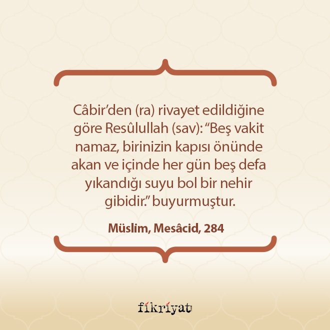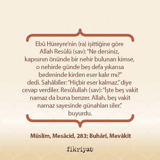 Ebû Hüreyre'nin (ra) işittiğine göre Allah Resûlü (sav): "Ne dersiniz, kapısının önünde bir nehir bulunan kimse, o nehirde günde beş defa yıkansa bedeninde kirden eser kalır mı?" dedi. Sahâbîler: "Hiçbir eser kalmaz." diye cevap verdiler. Resûlullah (sav): "İşte beş vakit namaz da buna benzer. Allah, beş vakit namaz sayesinde günahları siler." buyurdu.