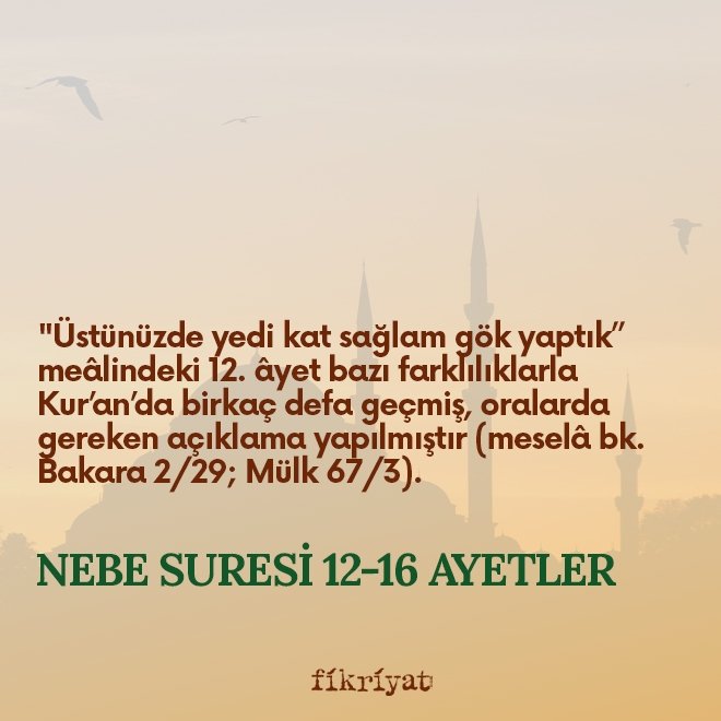◼ "Üstünüzde yedi kat sağlam gök yaptık" meâlindeki 12. âyet bazı farklılıklarla Kur'an'da birkaç defa geçmiş, oralarda gereken açıklama yapılmıştır (meselâ bk. Bakara 2/29; Mülk 67/3). Kubbemsi gökleri, alev alev yanarak dünyayı aydınlatan güneşi, bolca yağmur indirerek yeryüzünde birçok nimetin yetişmesine ve hayatın devam etmesine vesile olan bulutları yaratan yüce kudret, bu evreni yok edip mahiyeti ve sistemiyle yeni bir âlem kurmaya elbette kadirdir; işte o âhiret âlemidir.