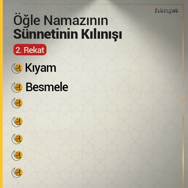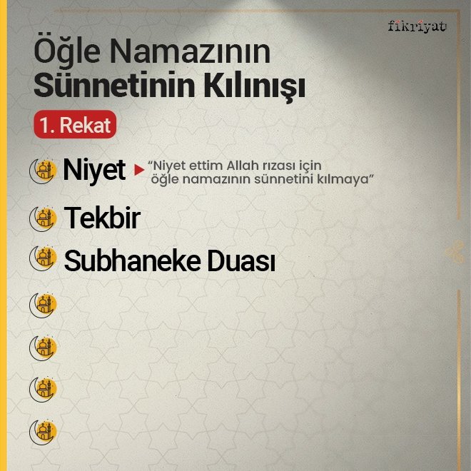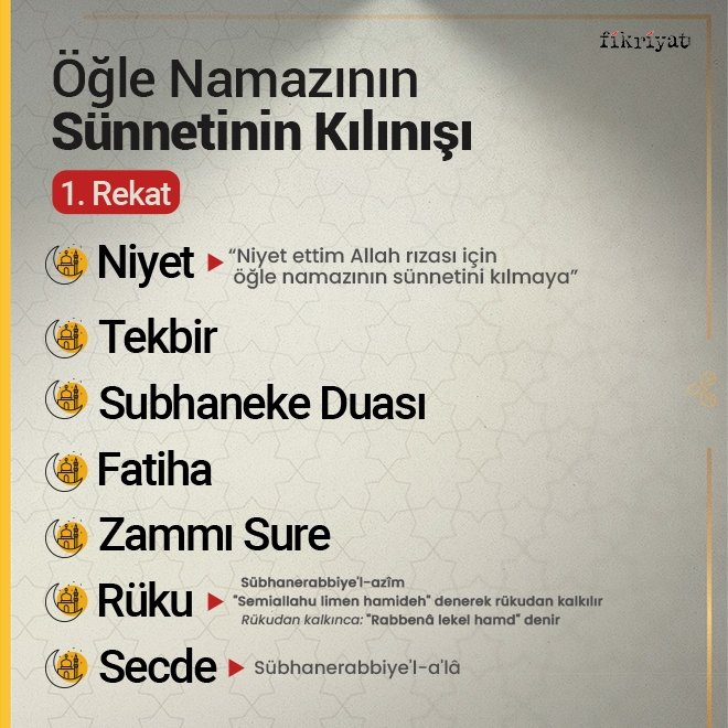 🔷 Namaza başlamadan önce abdest alınır. Namazı ikame edecek temiz bir yerde kıbleye dönerek hazır hale gelinir. Öğle namazının ilk sünneti 4 rekattır.