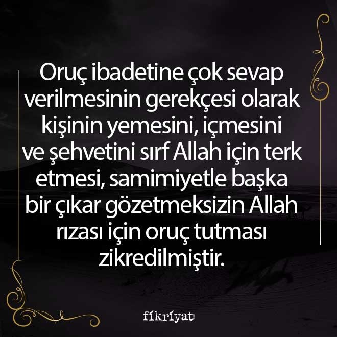 ⚫ Biri oruç ibadetinin sırf Allah için yerine getirildiği yani bu ibadette riyanın olmayacağı, diğeri ise ihlas ile tutulan orucun Allah katındaki sevabının çok olmasıdır. Oruç ibadetine çok sevap verilmesinin gerekçesi olarak kişinin yemesini, içmesini ve şehvetini sırf Allah için terk etmesi, samimiyetle başka bir çıkar gözetmeksizin Allah rızası için oruç tutması zikredilmiştir.