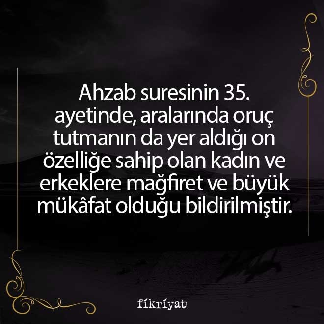 ⚫ Ahzab suresinin 35. ayetinde, aralarında oruç tutmanın da yer aldığı on özelliğe sahip olan kadın ve erkeklere mağfiret ve büyük mükafat olduğu bildirilmiştir.