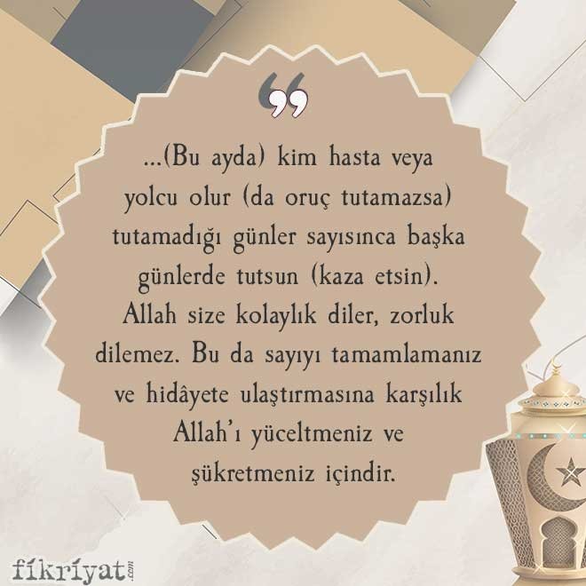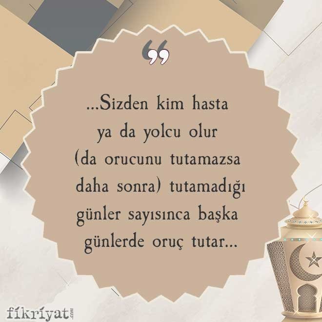 "…Sizden kim hasta yada yolcu olur (da orucunu tutamazsa daha sonra) tutamadığı günler sayısınca başka günlerde oruç tutar…." (Bakara, 184).